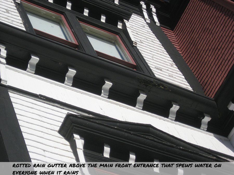 It is disheartening to see the old Academy in such a sad state. Rotten drain gutters above entrances is resulting in a host of problems: water spewing over people as they walk into the school below the gutter at the main entrance, extensive rot in the building is forming from water getting behind the cladding or mouldings due to malfunctioning rain gutters. Doors are rotting due to water finding its way between the walls of the entrance causing the original doors rotting out.
