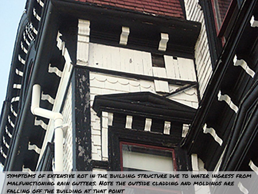 Along with replacing all the gutters, at 150.00 per linear foot, there is also necessary structural work to be done as well. Because water which should be draining off the building through the gutters has been finding its way behind shingles and inside doors, there is a fair bit of structural work to do: replacing the shingles and moldings where necessary, overhauling the damage to the underlying structure and replacing the rot in the inside walls and door transom.